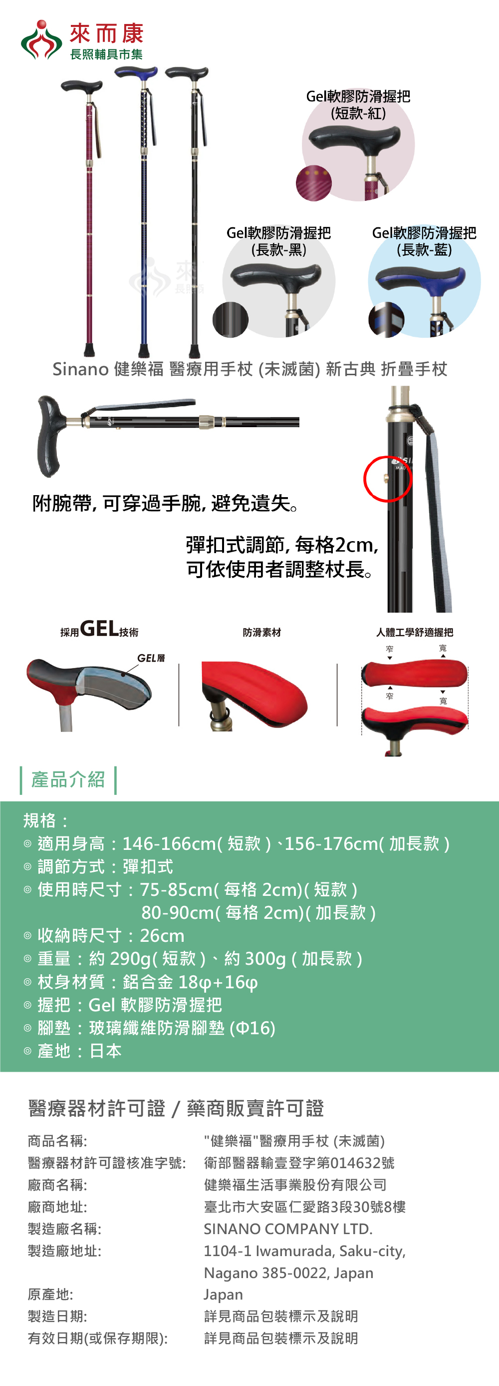 門市購買更優惠 週年慶 Sinano 健樂福 醫療用手杖 (未滅菌) 新古典 折疊手杖 鋁合金 拐杖 摺疊杖 手杖 單手杖 日本製
