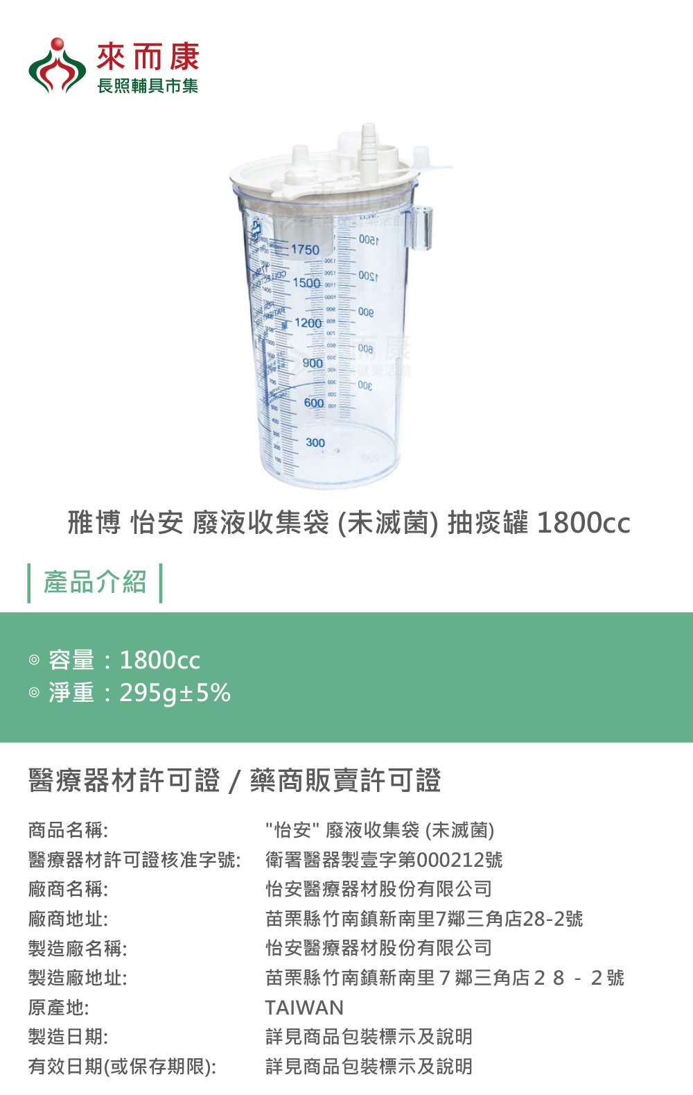 雃博 怡安 廢液收集袋 (未滅菌) 抽痰罐 1800cc 照護 倍護 專用抽痰杯 抽痰機配件