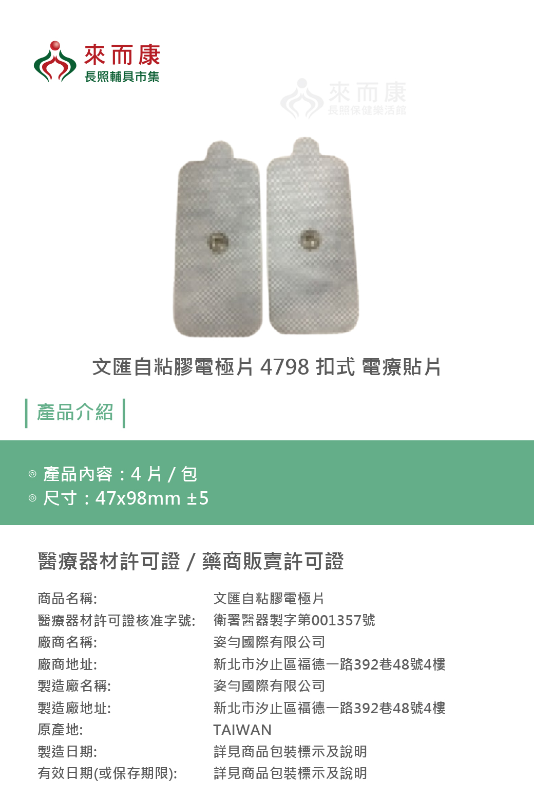 文匯自粘膠電極片 4798 扣式 電療貼片 電極貼片 鈕扣式電療貼片 網路不販售來電詢問