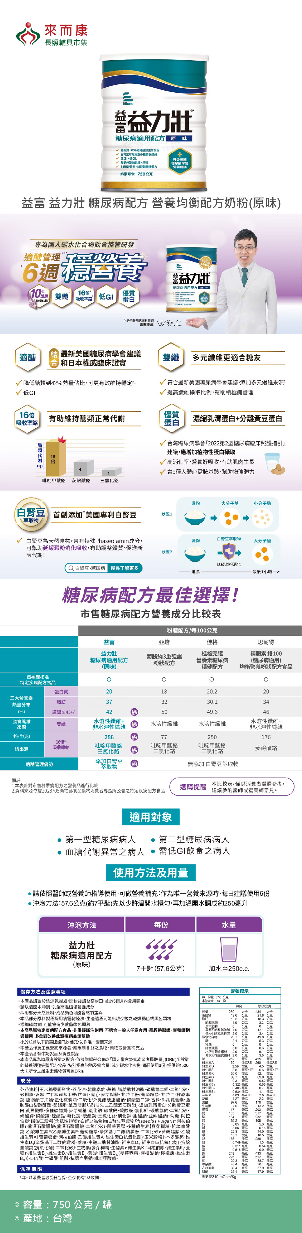 益富 益力壯 糖尿病配方 營養均衡配方奶粉(原味)(750g/罐) 12罐販售