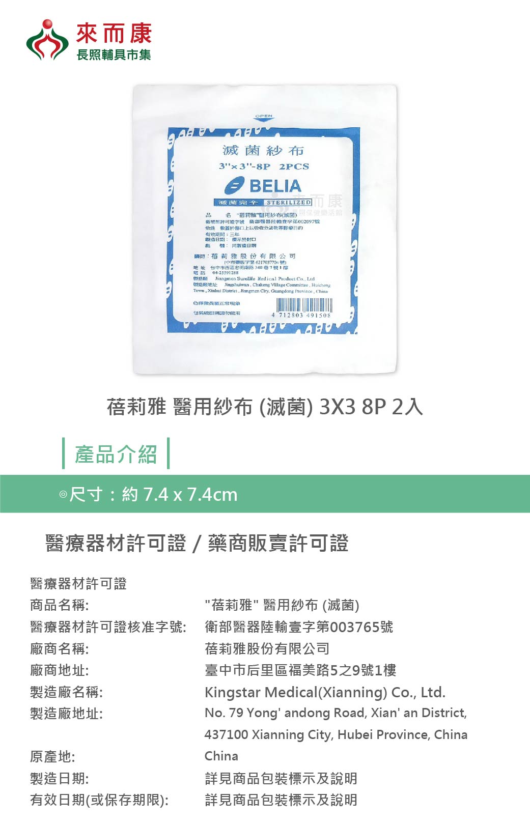 蓓莉雅 醫用紗布 (滅菌) 3X3 8P 2入/包 100包販售 滅菌 醫用 紗布 紗布塊
