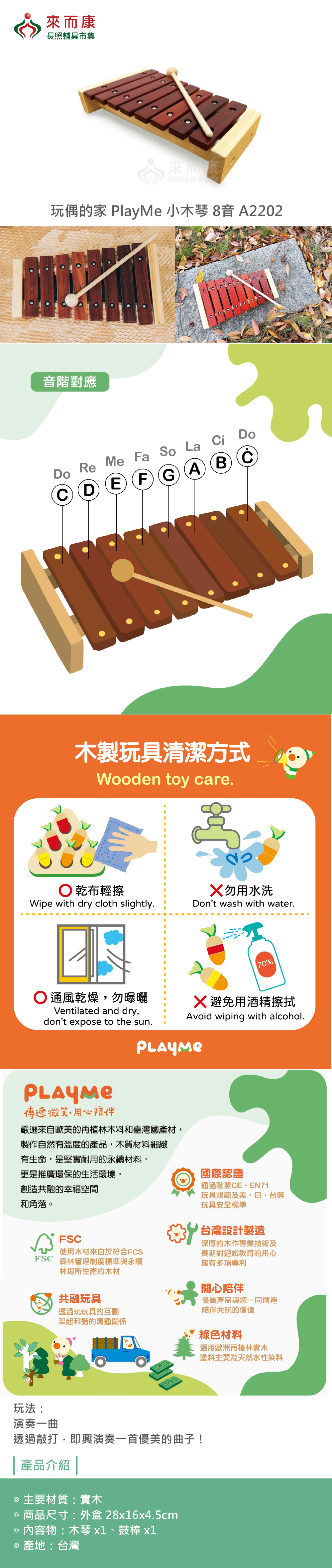 由8音組成( C、D、E、F、G、A、B、C ),天然實木製作,色彩自然呈現,聲音清脆悅耳。琴鍵皆由調音師手工調整校對,音準正確,可以真正敲出歌曲!讓接觸音樂變的更有趣。