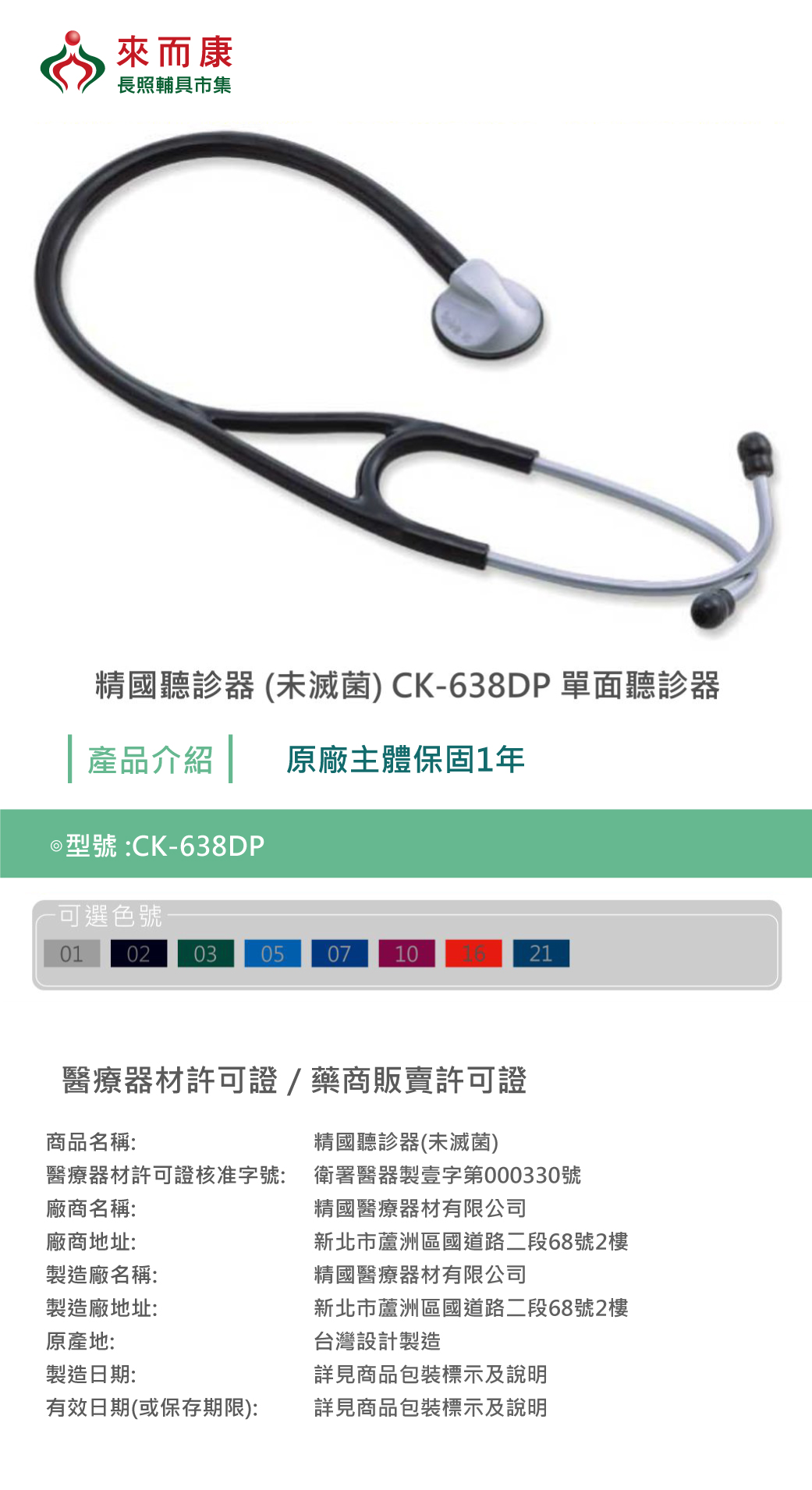 Spirit 精國聽診器 (未滅菌) CK-638DP 心臟科 單面 聽診器 診聽 診聽器 顏色隨機出貨 CK638DP