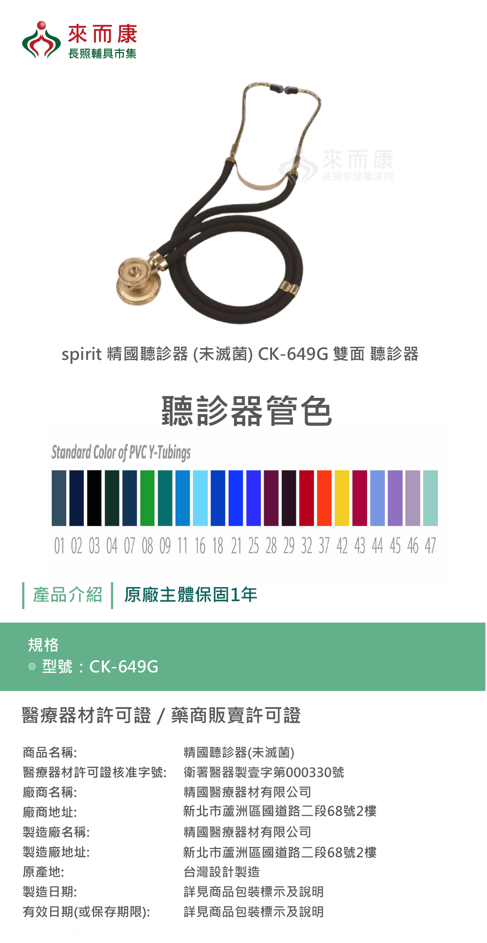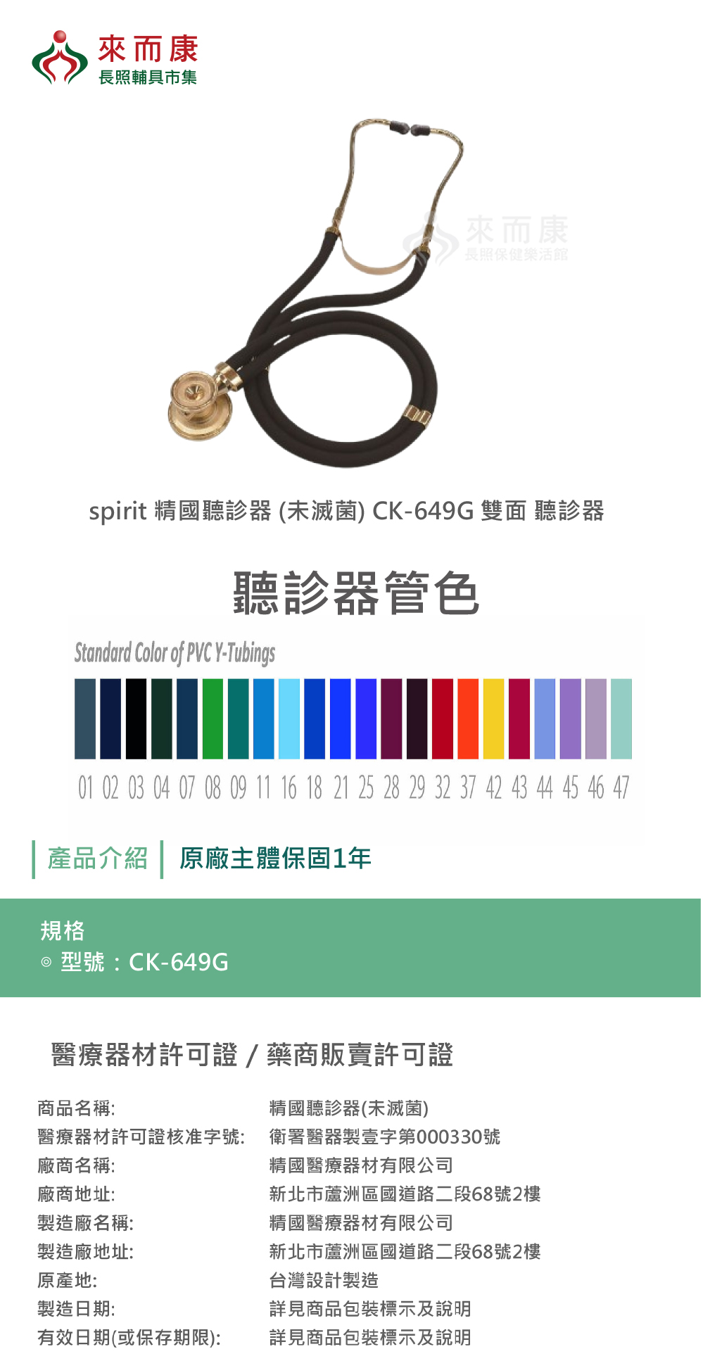 spirit 精國聽診器 (未滅菌) CK-649G 心臟科 雙面 聽診器 心跳 診聽器 成人用 黑色