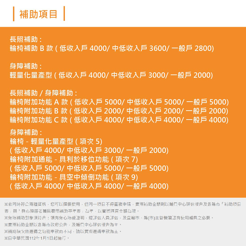 ※符合長照補助:輪椅B款、附加功能A+B+C