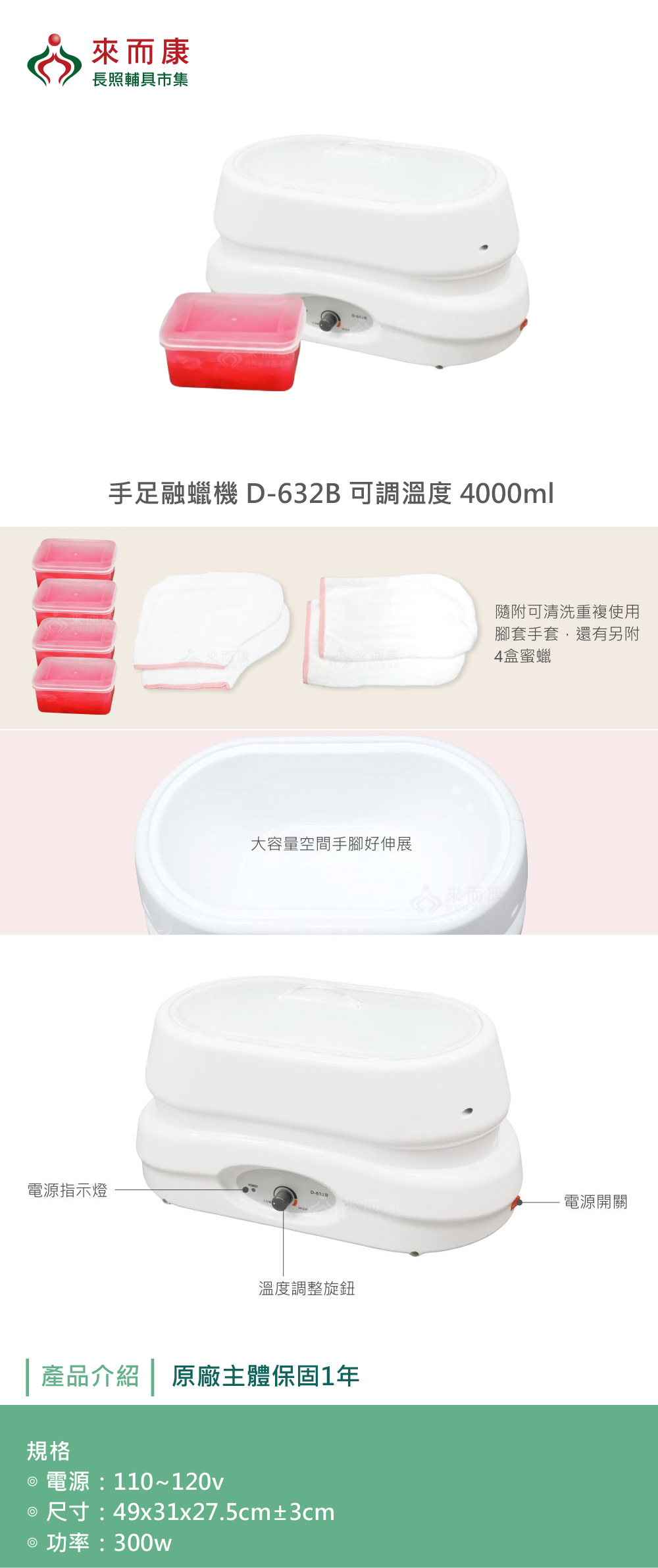 手足融蠟機 D-632B 可調溫度 4000ml 含4盒蜜蠟 護手套 護腳襪 融蠟機 熱蠟機 手膜 蜜蠟 加熱器 D-632B