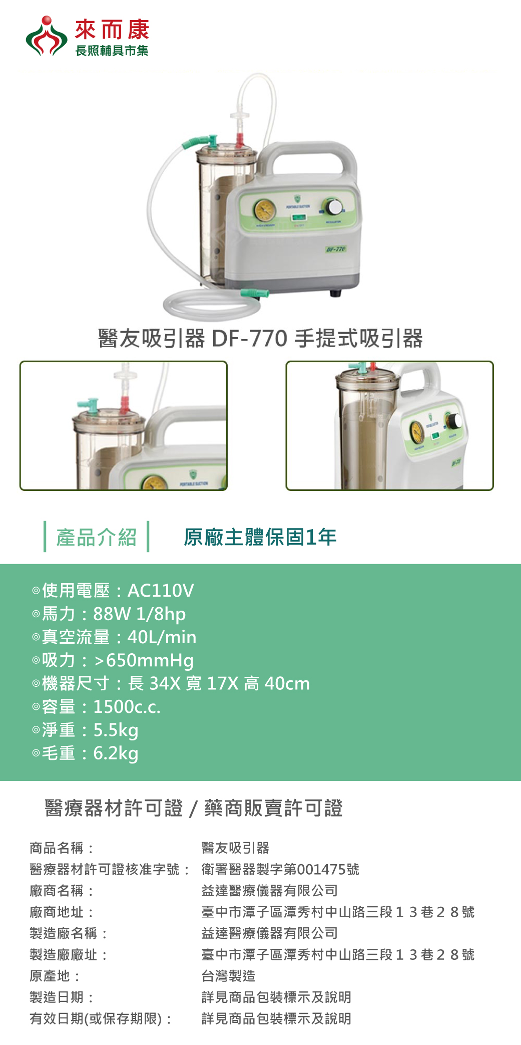 醫友吸引器 DF-770 手提式吸引器 手提式抽痰機 吸引器 網路不販售來電詢問