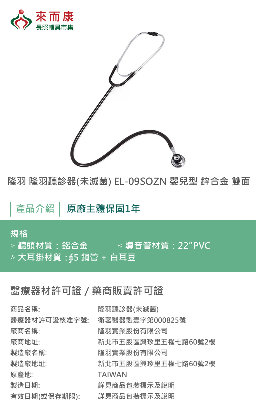 隆羽 隆羽聽診器(未滅菌) EL-09SOZN 嬰兒型 鋅合金 雙面 聽診器 聽診 診聽器 EL09SOZN