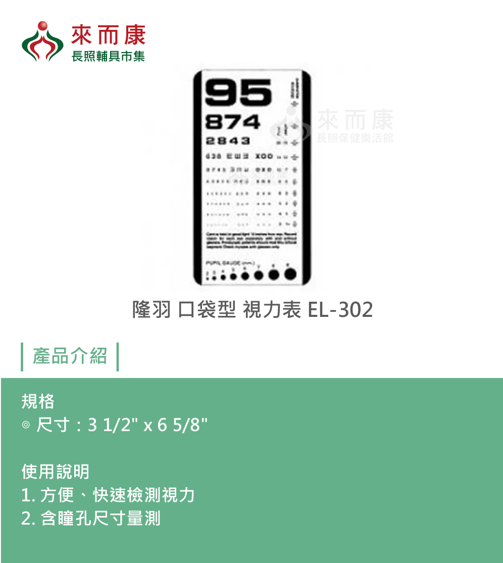 隆羽 口袋型 視力表 EL-302 視力卡 視力測量 視力測量表 視力檢查表 瞳孔尺寸量測 EL302