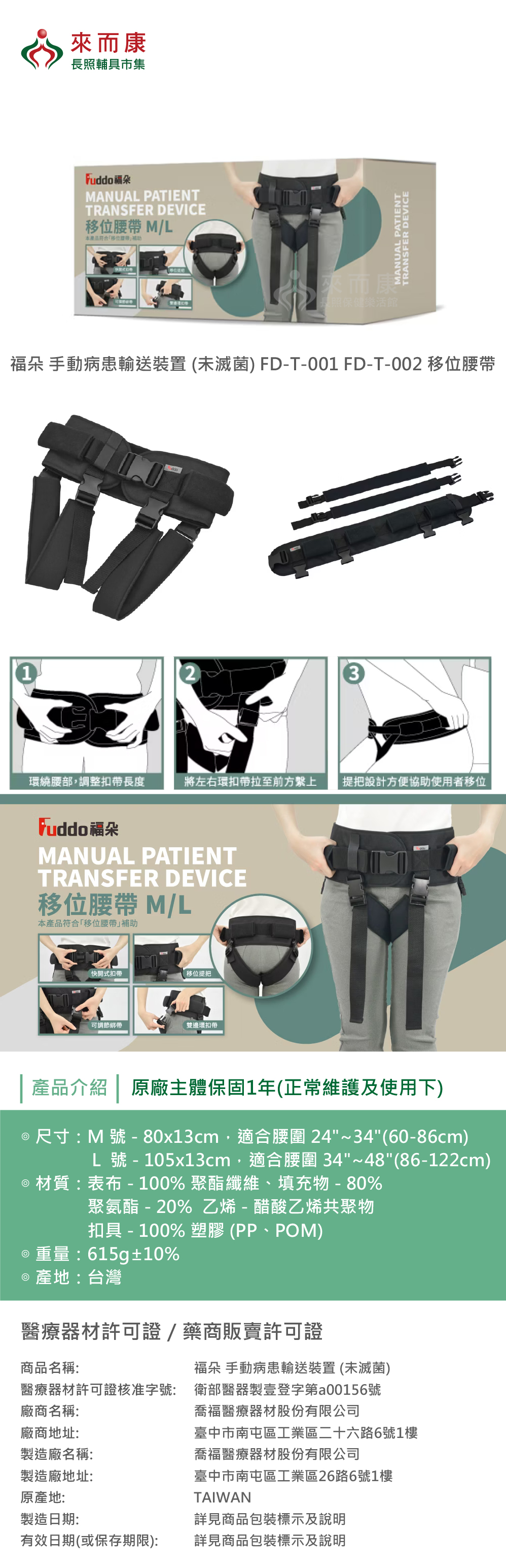Fuddo 福朵 手動病患輸送裝置 (未滅菌) FD-T-001 FD-T-002 移位腰帶 輔助帶 移位腰帶補助