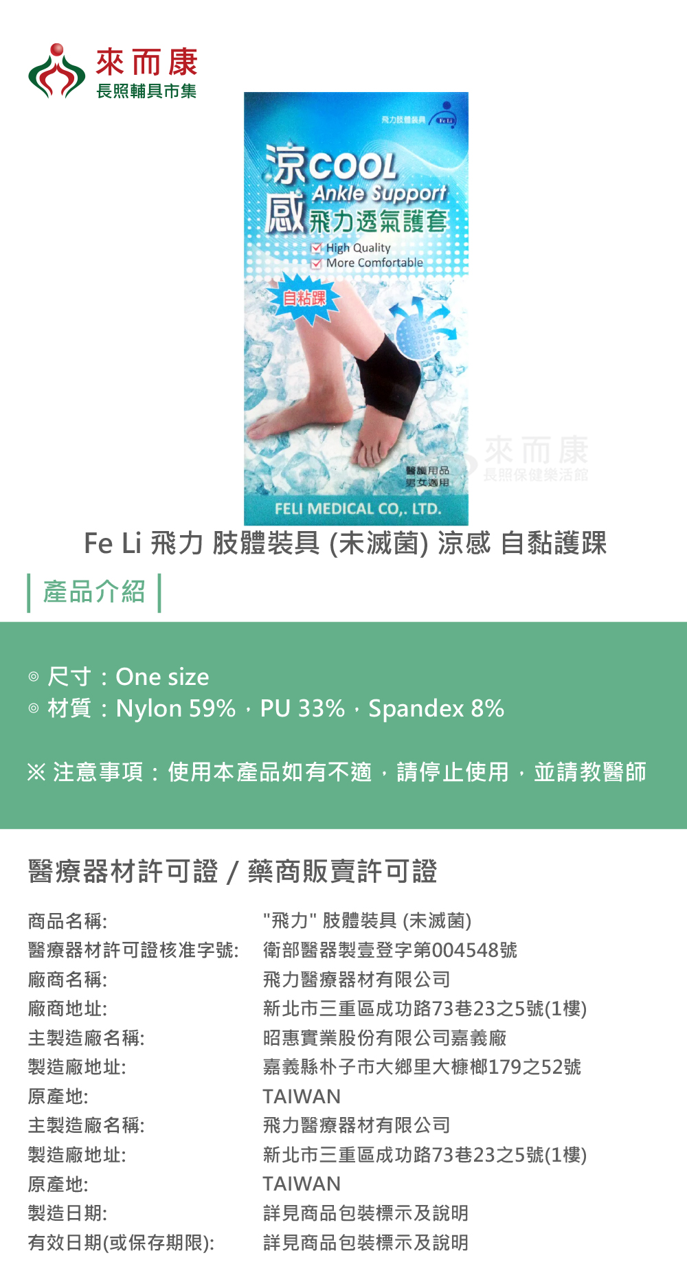 Fe Li 飛力 肢體裝具 (未滅菌) 涼感 自黏護踝 透氣 護套 One size 自黏式 護踝 護具 男女適用