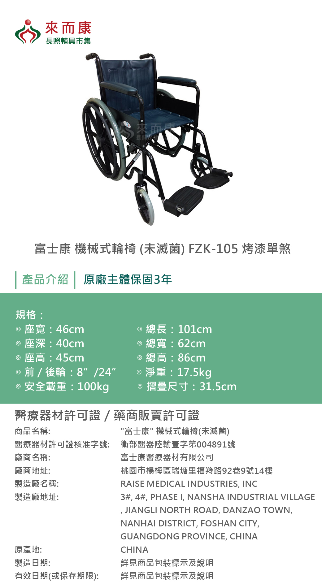 富士康 機械式輪椅 (未滅菌) FZK-105 烤漆單煞 FZK105 輪椅A款補助 捐贈輪椅 鐵製輪椅