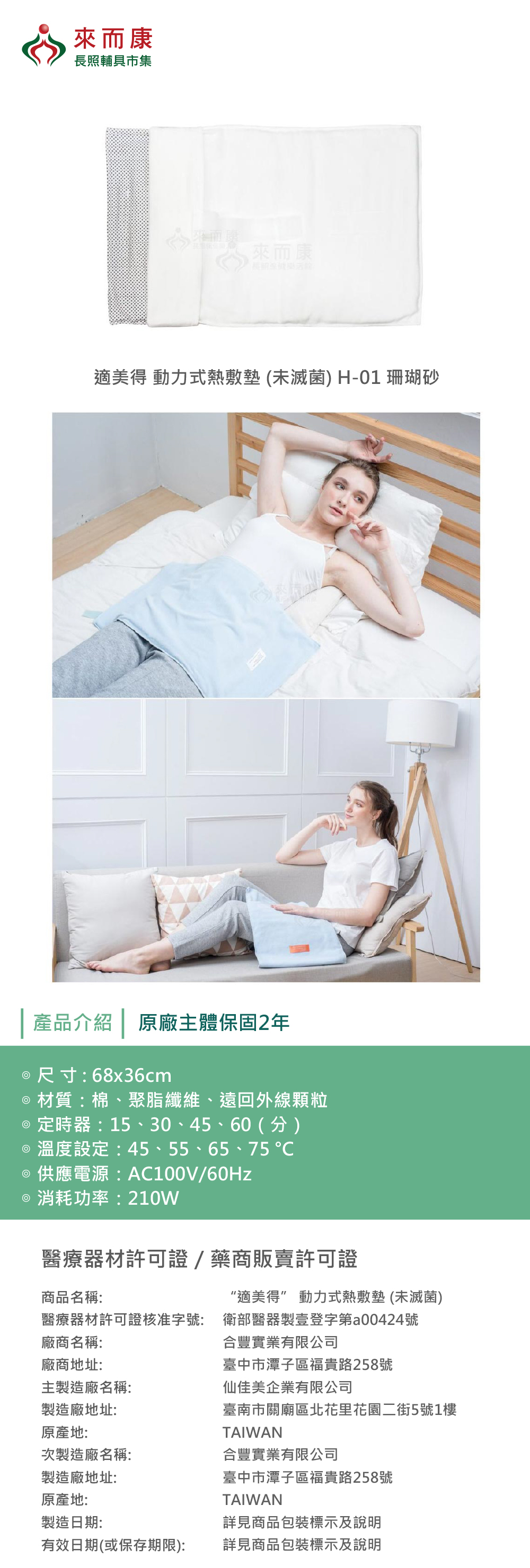 適美得 動力式熱敷墊 (未滅菌) H-01 珊瑚砂 68x36cm 適用腰背 熱敷墊 電熱毯 H01