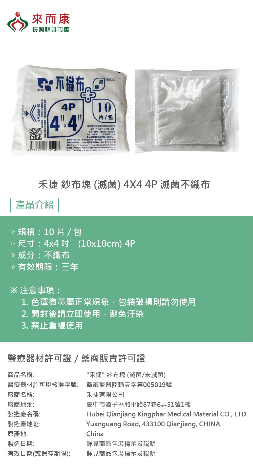 禾捷 紗布塊 (滅菌) 4X4 4P 滅菌不織布 10片/包 400包/箱 滅菌 不織布 紗布