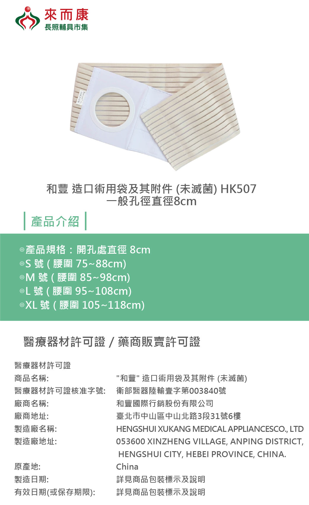 和豐 造口術用袋及其附件 (未滅菌) HK507 一般孔徑直徑8cm 造口束腹帶 疝氣 造口 腰帶 造口固定器