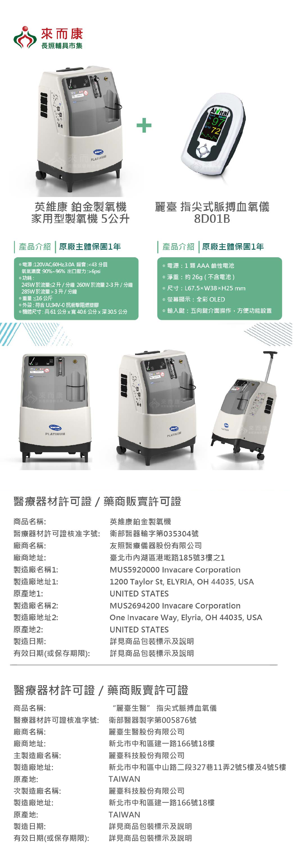 Invacare Platinum 5NXG 家用型 製氧機 + 8D01B 血氧機:1030434+1030435