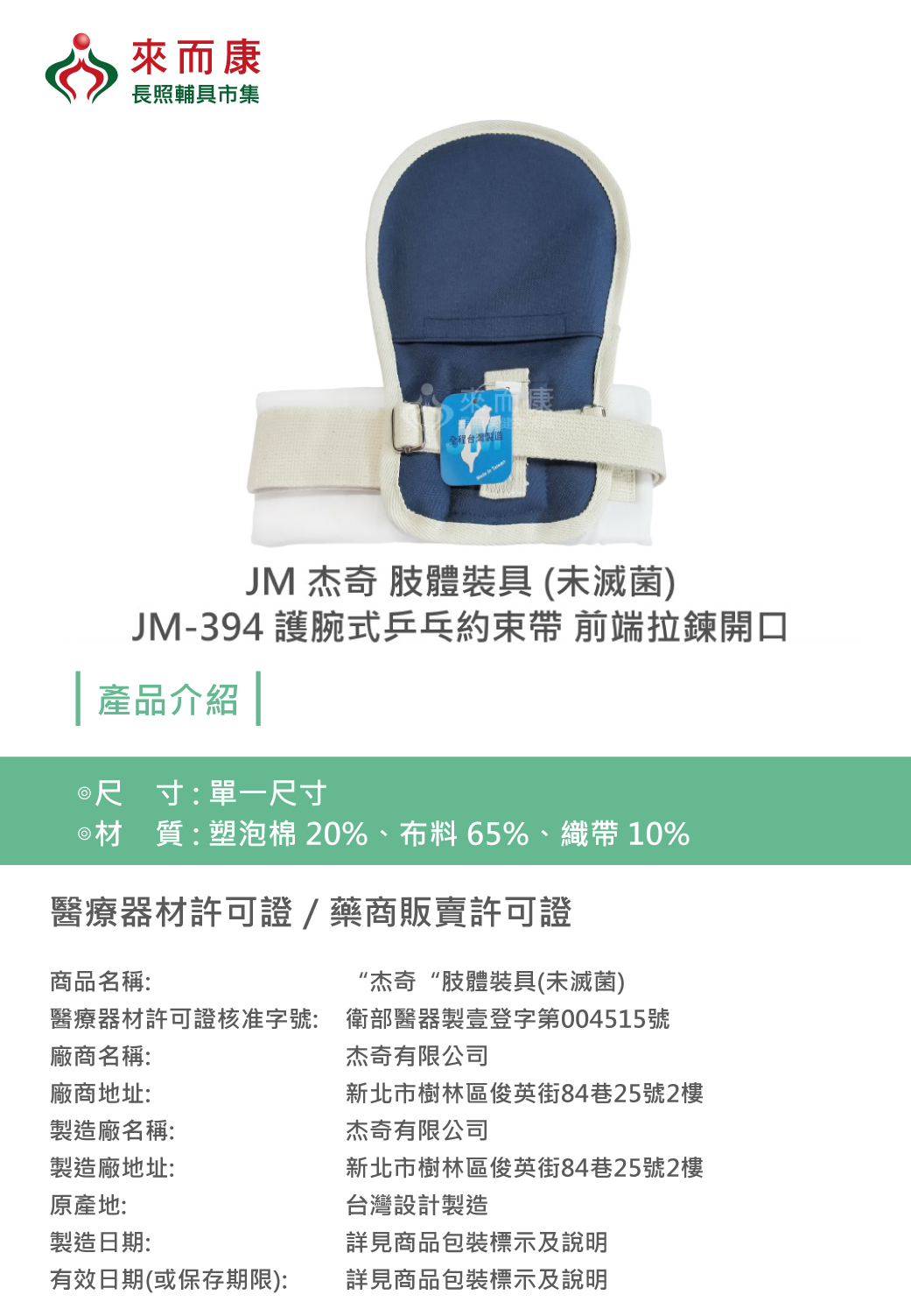 JM 杰奇 肢體裝具 (未滅菌) JM-394 護腕式 乒乓約束帶 二個販售 前端拉鍊 開口 約束帶 JM394