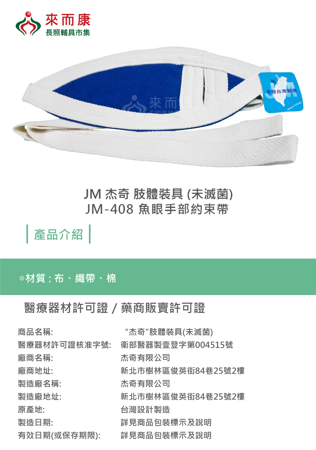 JM 杰奇 肢體裝具 (未滅菌) JM-408 魚眼型 手部 約束帶 魚眼 床上固定 安全帶 JM408