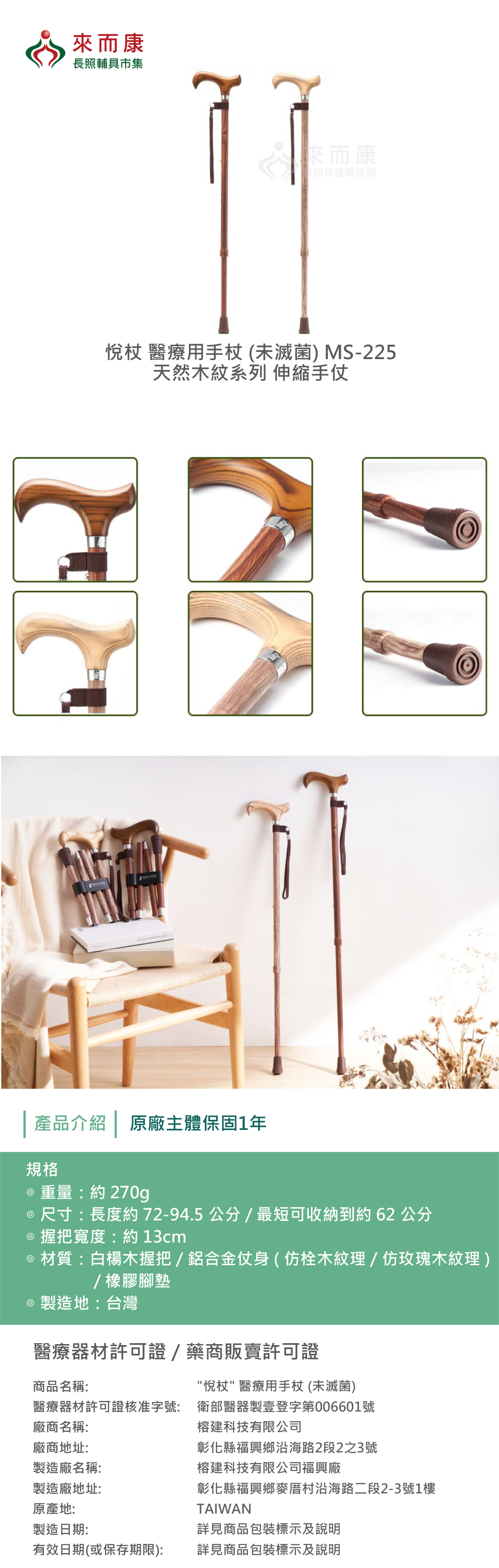 Merry Sticks 悅杖 醫療用手杖(未滅菌) MS-225 天然木紋系列 伸縮手杖 鋁合金手杖 MS225