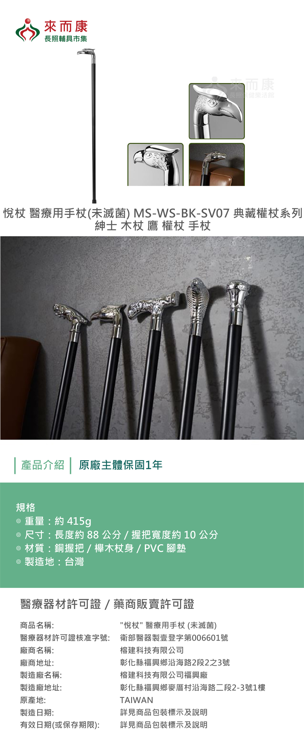 Merry Sticks 悅杖 醫療用手杖(未滅菌) MS-WS-BK-SV07 典藏權杖系列 紳士 木杖 鷹 權杖 手杖 MSWSBKSV07