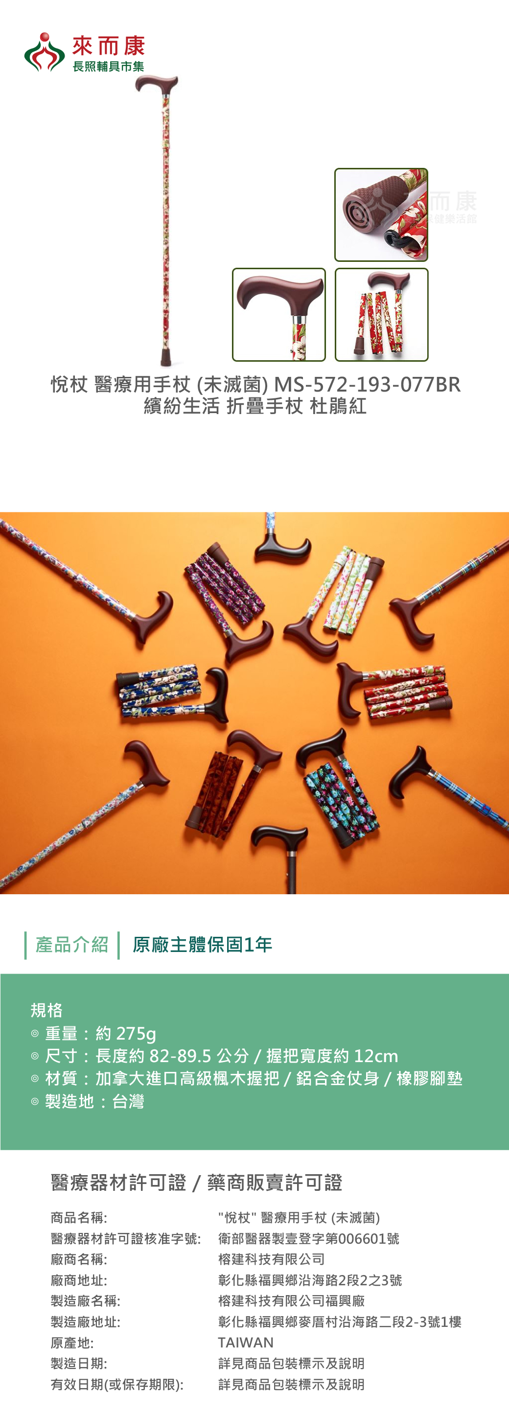 Merry Sticks 悅杖 醫療用手杖 (未滅菌) MS-572-193-077BR 繽紛生活 折疊手杖 杜鵑紅 MS572193077BR