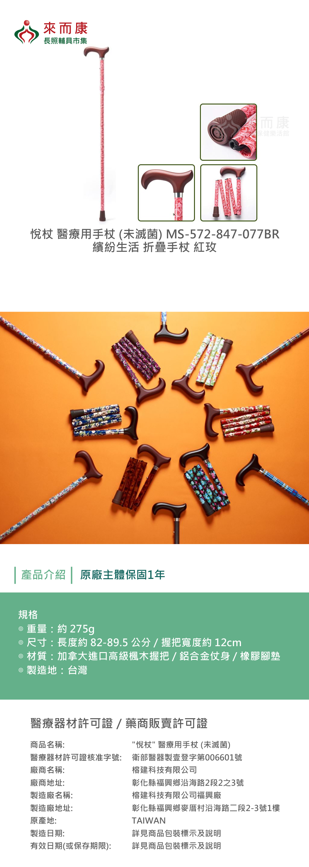 Merry Sticks 悅杖 醫療用手杖 (未滅菌) MS-572-847-077BR 繽紛生活 折疊手杖 紅玫 MS572847077BR