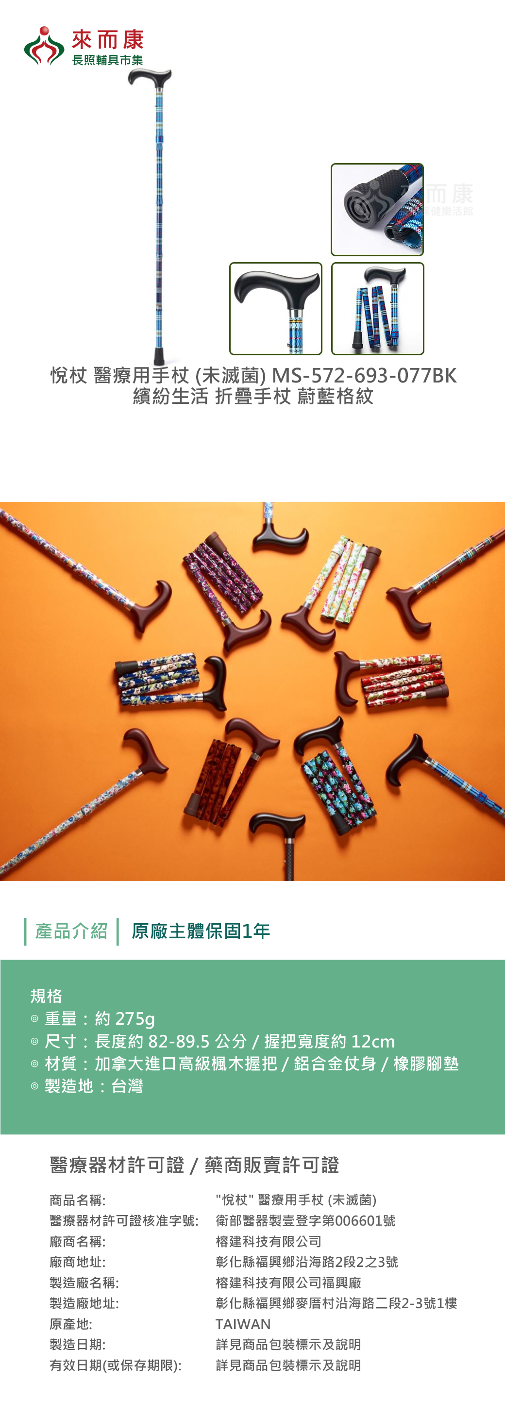 Merry Sticks 悅杖 醫療用手杖 (未滅菌) MS-572-693-077BK 繽紛生活 折疊手杖 蔚藍格紋 MS572693077BK