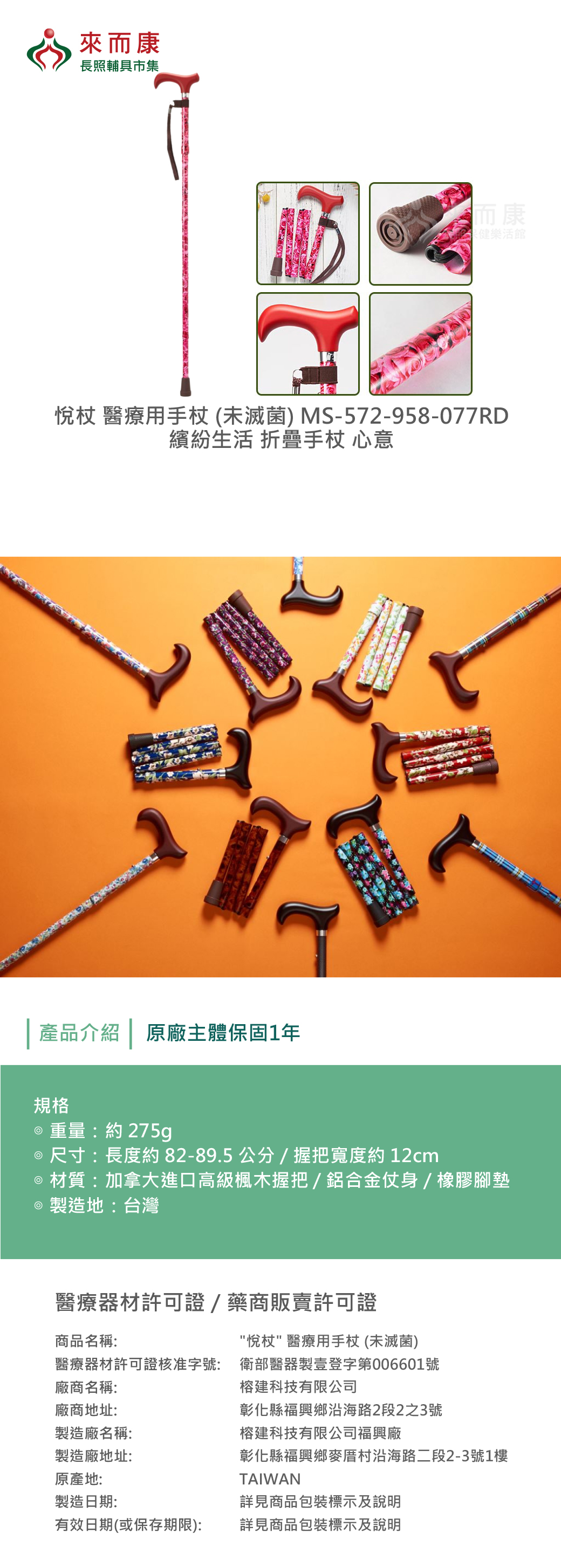 Merry Sticks 悅杖 醫療用手杖 (未滅菌) MS-572-958-077RD 繽紛生活 折疊手杖 心意 MS572958077RD