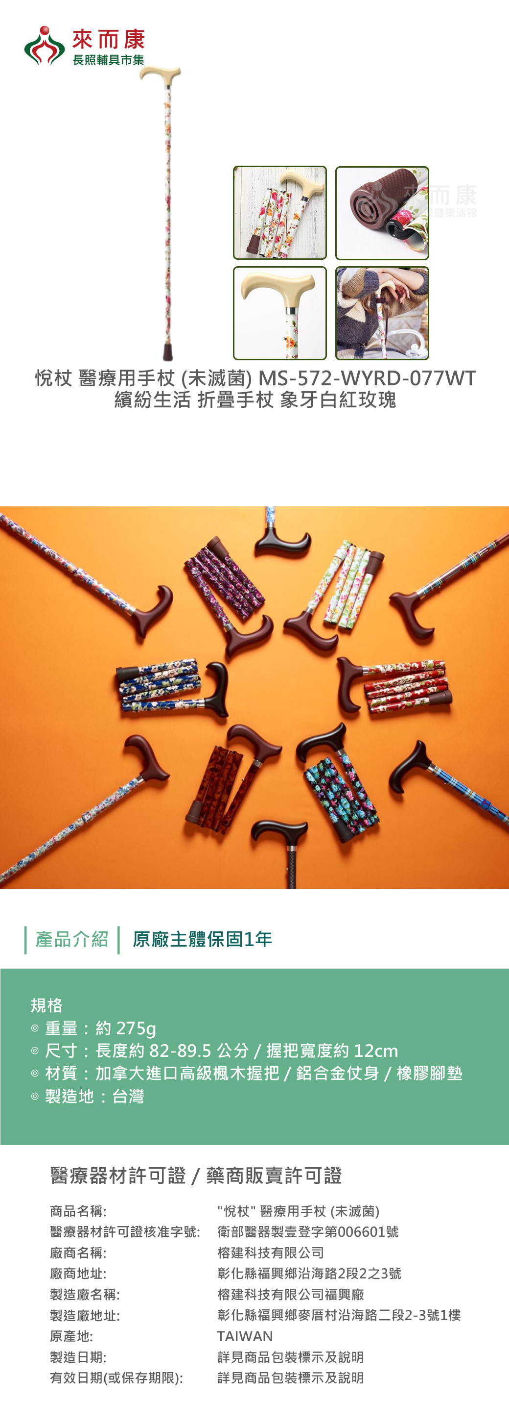 Merry Sticks 悅杖 醫療用手杖 (未滅菌) MS-572-WYRD-077WT 繽紛生活 折疊手杖 象牙白紅玫瑰 MS572WYRD077WT