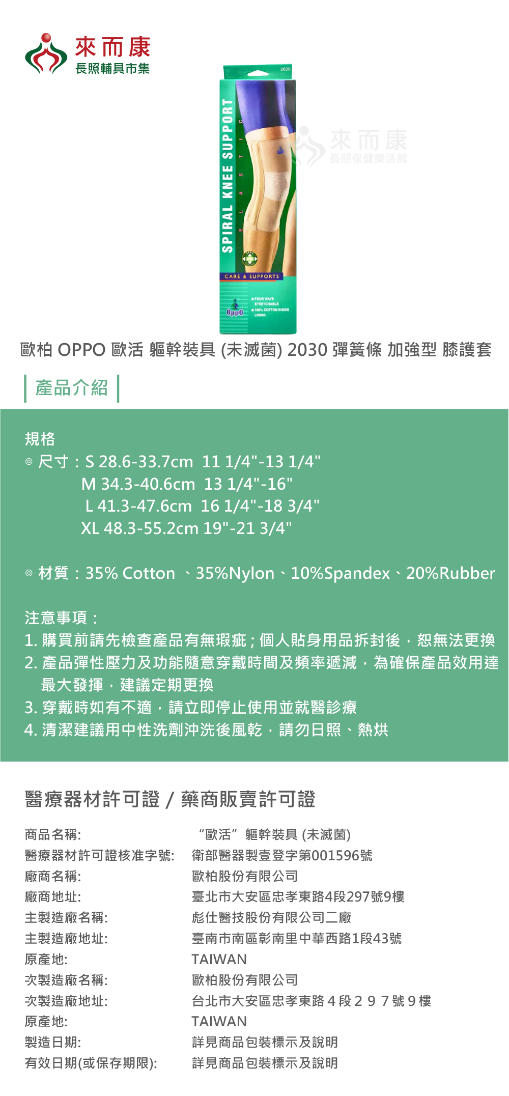 歐柏 OPPO 歐活 軀幹裝具 (未滅菌) 2030 彈簧條 加強型膝護套 膝部 護套 護具