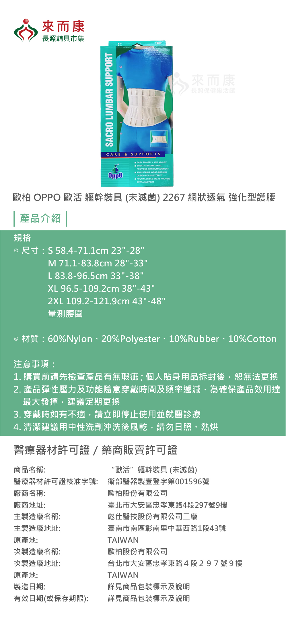 歐柏 OPPO 歐活 軀幹裝具 (未滅菌) 2267 網狀透氣 強化型護腰 腰部 護套 護具