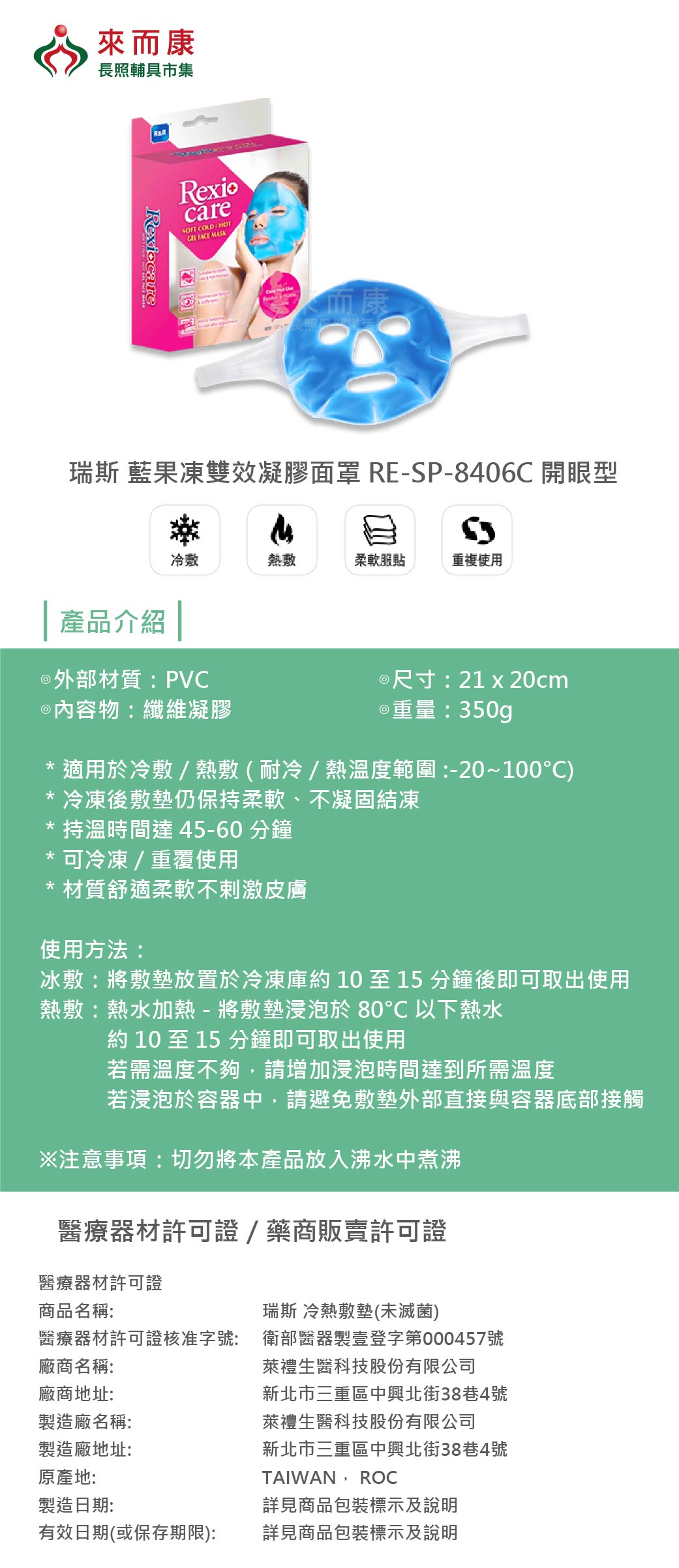 萊禮 瑞斯 冷熱敷墊 (未滅菌) RE-SP-8406C 開眼型 藍果凍雙效凝膠面罩 凝膠 面罩 RESP8406C