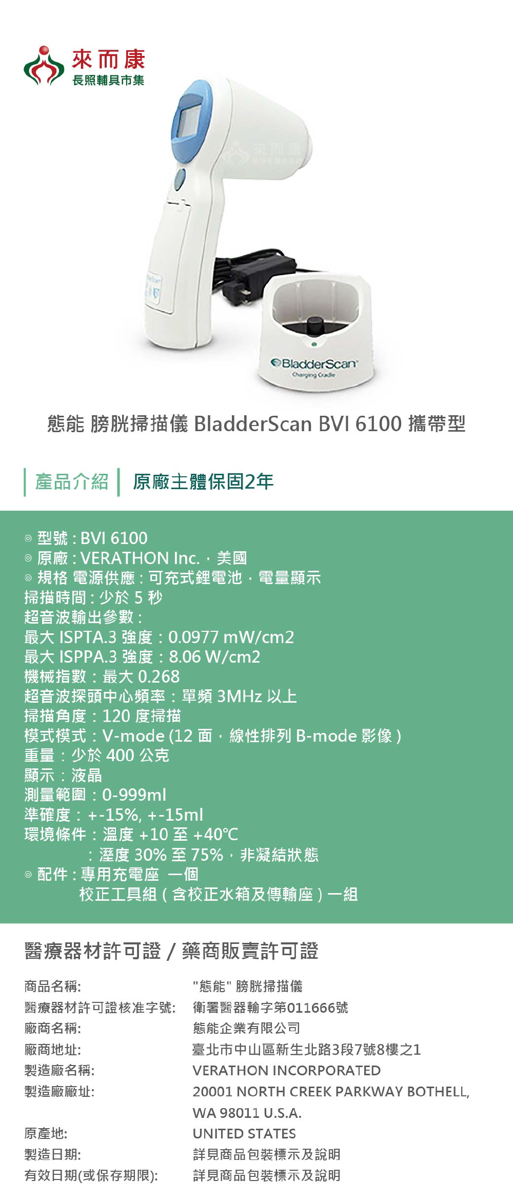 * BladderScan可簡單且非侵入性地測量膀胱體積,運用體內超音波反射產生膀胱立體影像,檢查之膀胱影像可於Verathon Incorporated先進的網路技術ScanPiont觀看,提供使用者查看、儲存及列印超音波結果。