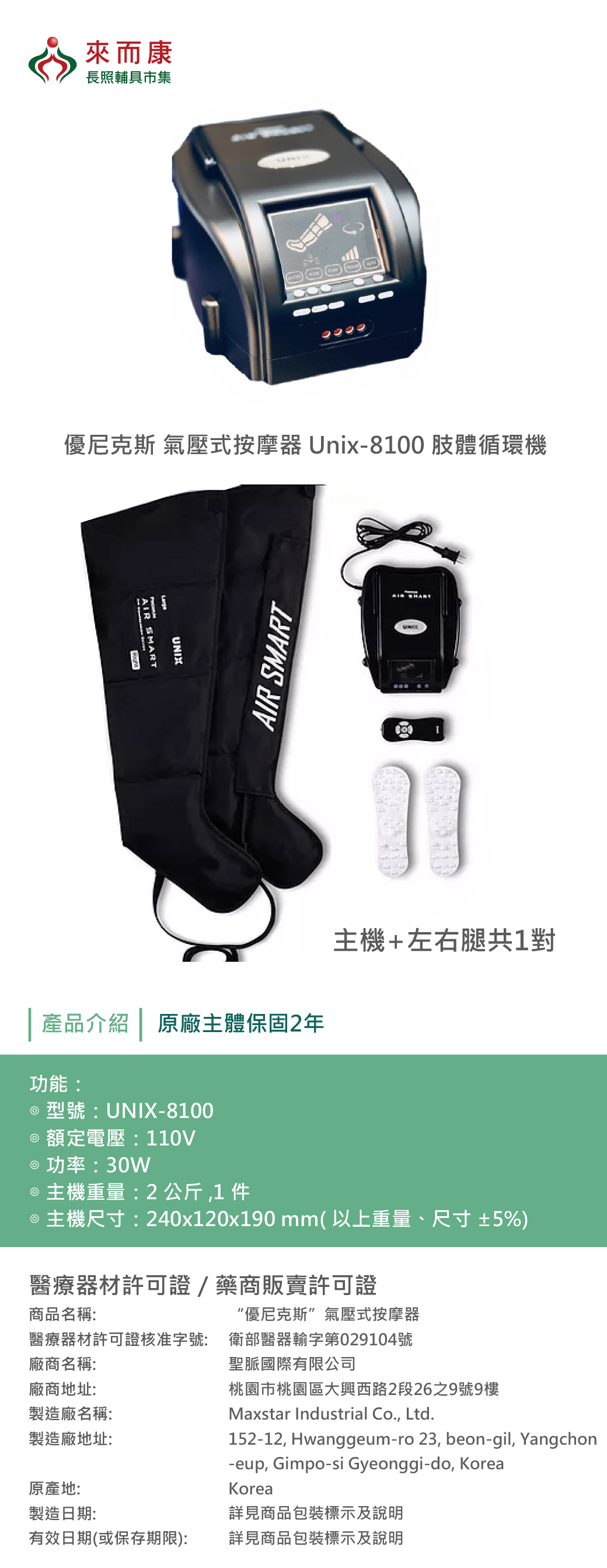 晁禾 優尼克斯 氣壓式按摩器 Unix-8100 肢體循環機 主機 + 腿部 左右1對 網路不販售來電詢問