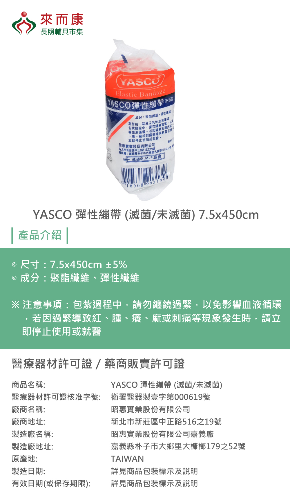 YASCO 彈性繃帶 (滅菌/未滅菌) 7.5x450cm 白色 彈力 彈性 包紮 繃帶