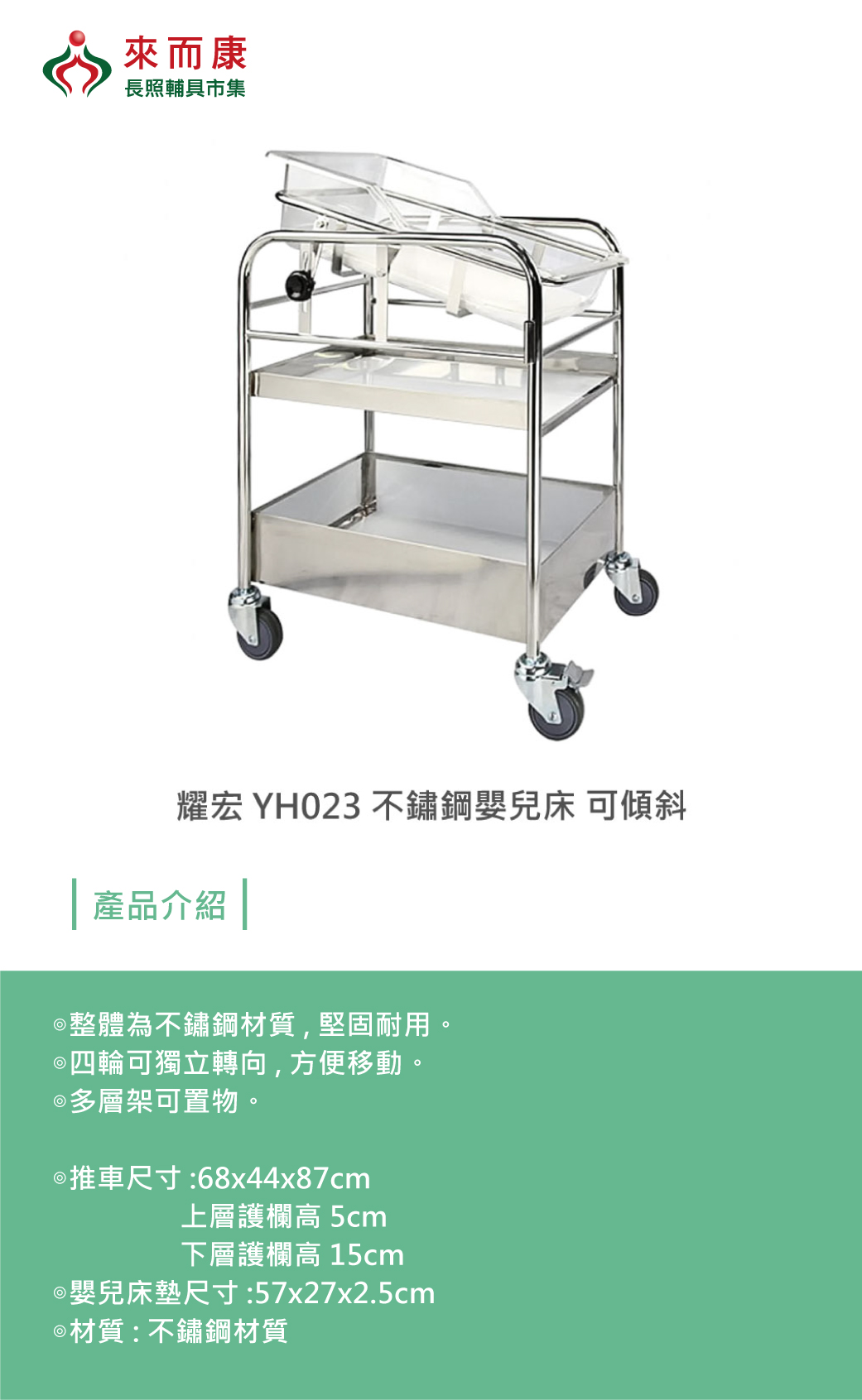 耀宏 不鏽鋼 嬰兒床 YH023 可傾斜 寶寶 照顧床 移動床 推車