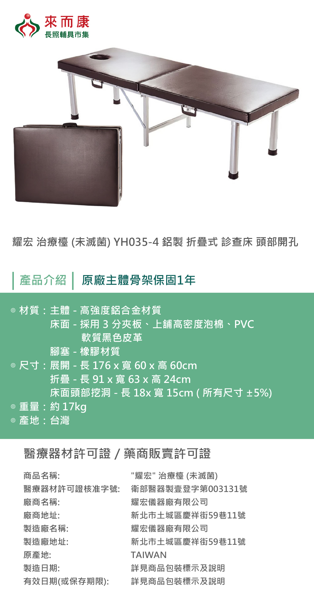 耀宏 治療檯 (未滅菌) YH035-4 鋁製 折疊式 診查床 頭部開孔 高60cm 挖洞 診療床 治療床 檢診床 護理床 YH0354