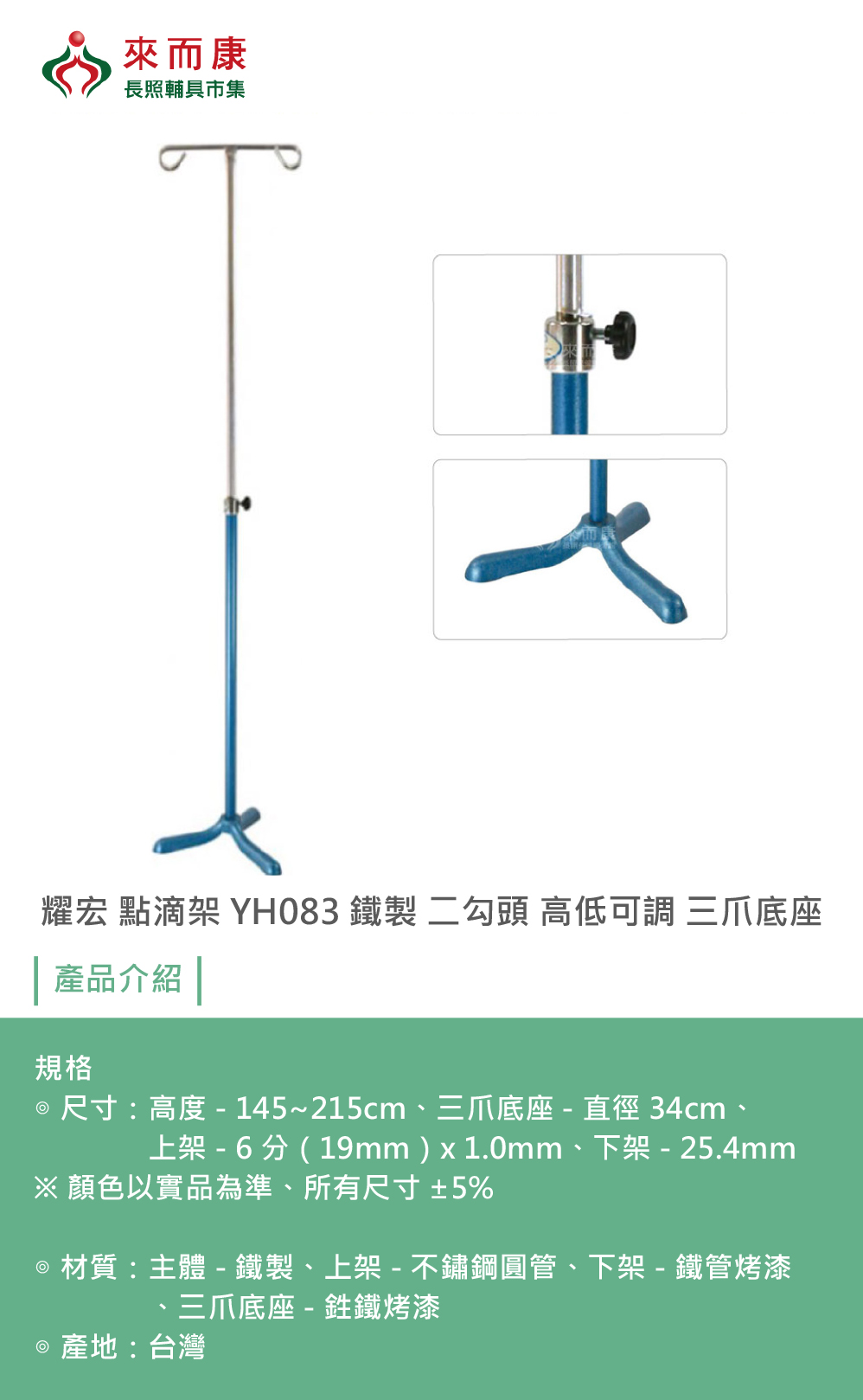 耀宏 點滴架 YH083 鐵製 二勾頭 高低可調 三爪底座 注射架 點滴 支架