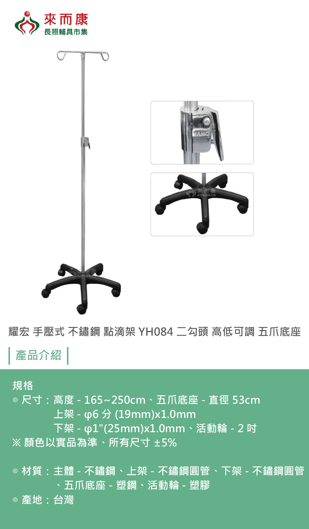 耀宏 手壓式 不鏽鋼 點滴架 YH084 二勾頭 高低可調 五爪底座 點滴 支架