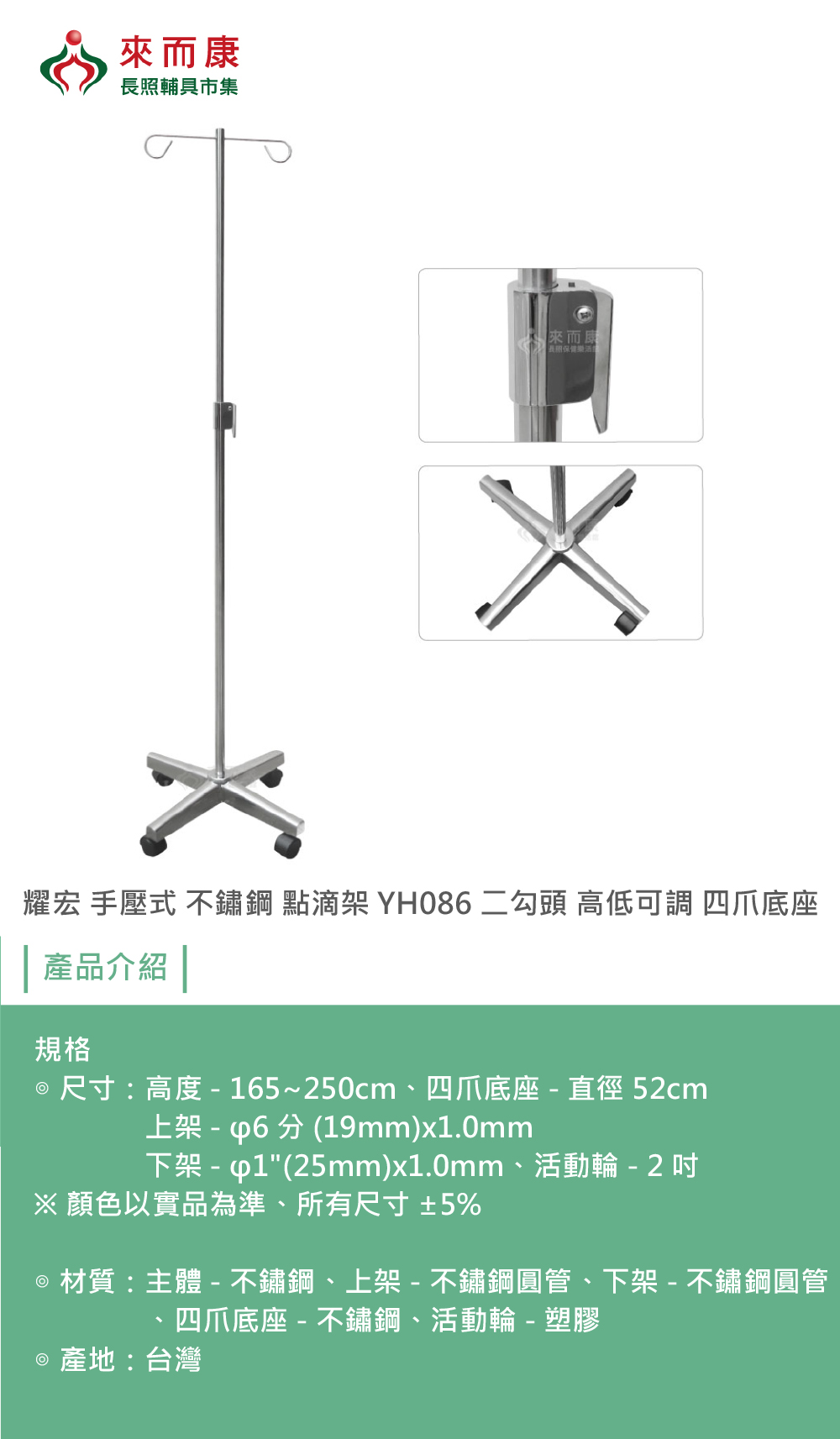 耀宏 手壓式 不鏽鋼 點滴架 YH086 二勾頭 高低可調 四爪底座 點滴 支架