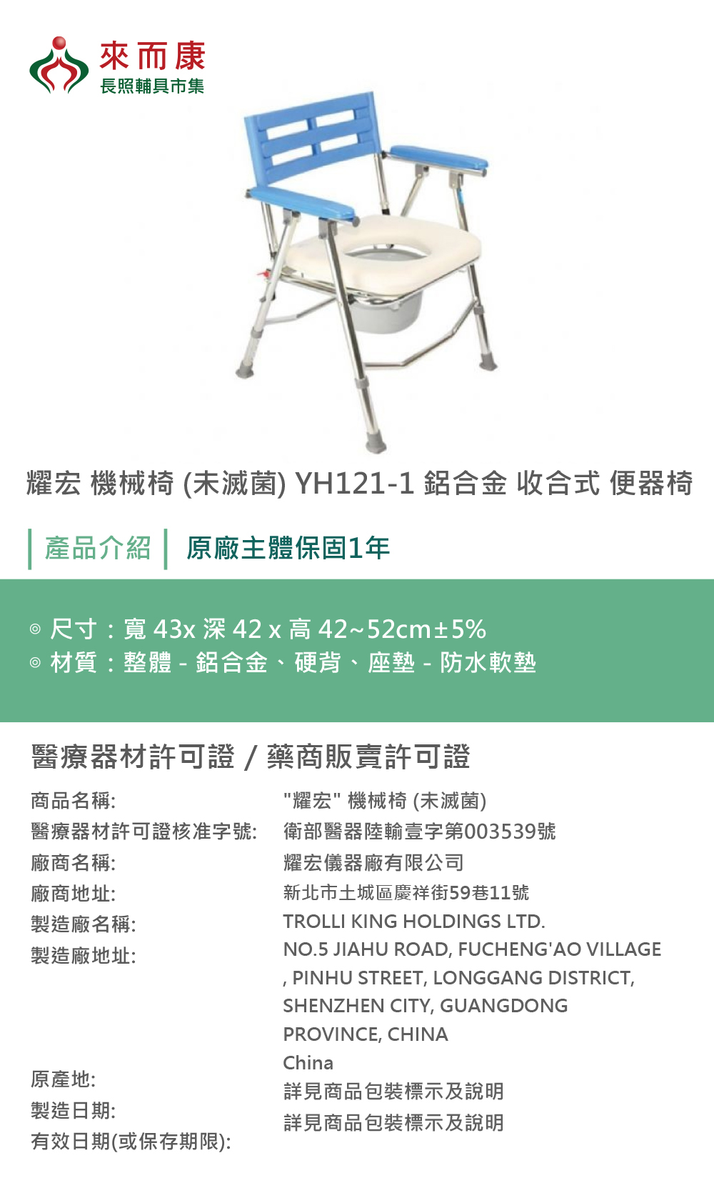 耀宏 機械椅 (未滅菌) YH121-1 鋁合金 收合式 便器椅 高低可調 便盆椅 YH1211