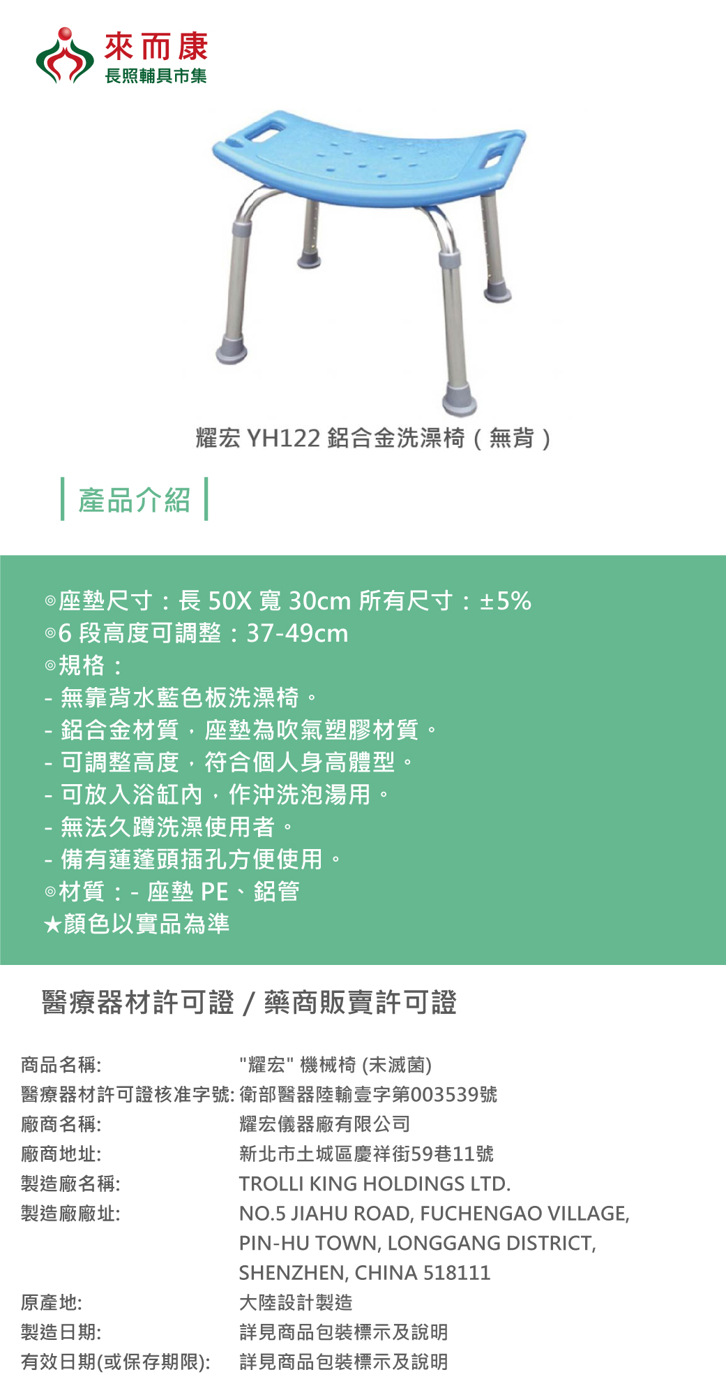 耀宏 機械椅 (未滅菌) YH122 鋁合金 洗澡椅 無背 浴室椅 沐浴椅