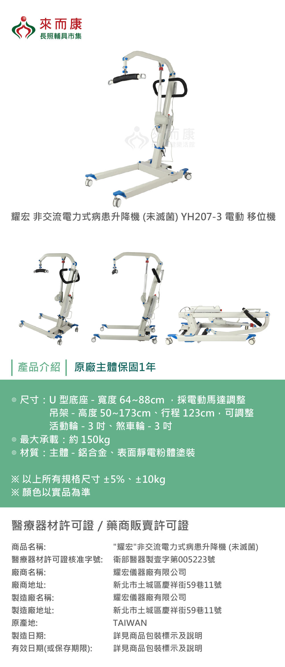 - 吊架採電動馬達上下升降,馬達附緊急下降功能,如因斷電或故障而無法動作時,可將病人緊急放下