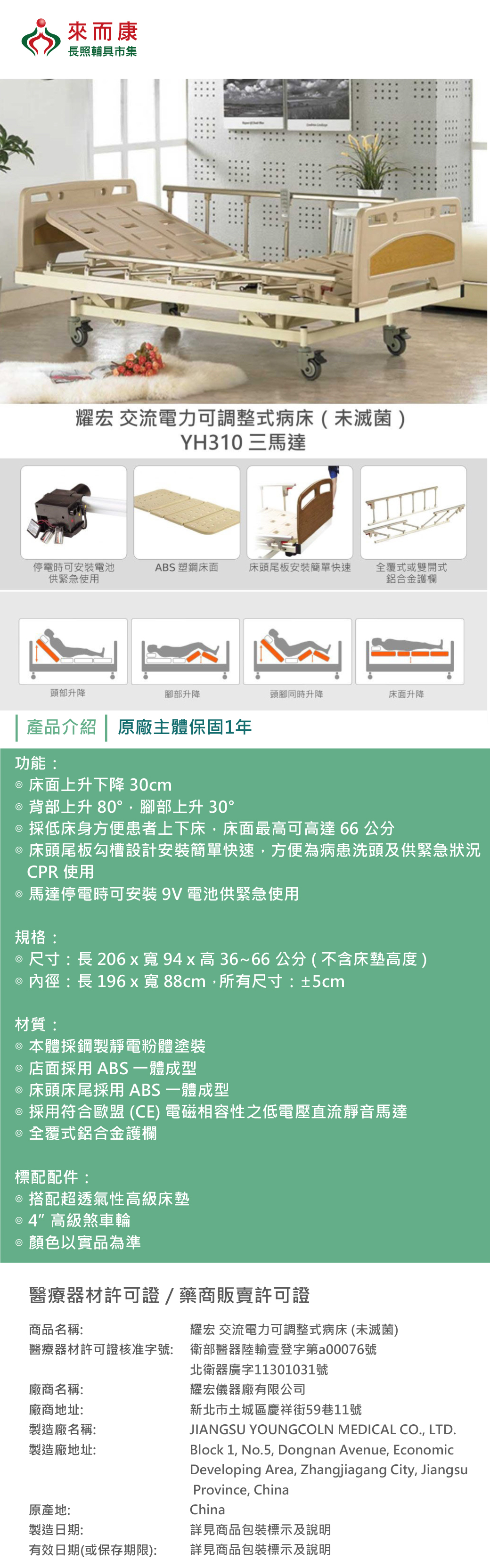 耀宏 交流電力可調整式病床(未滅菌) YH310 三馬達 電動床補助 附加功能A款B款 贈:床包X2+中單X2+實木桌板X1