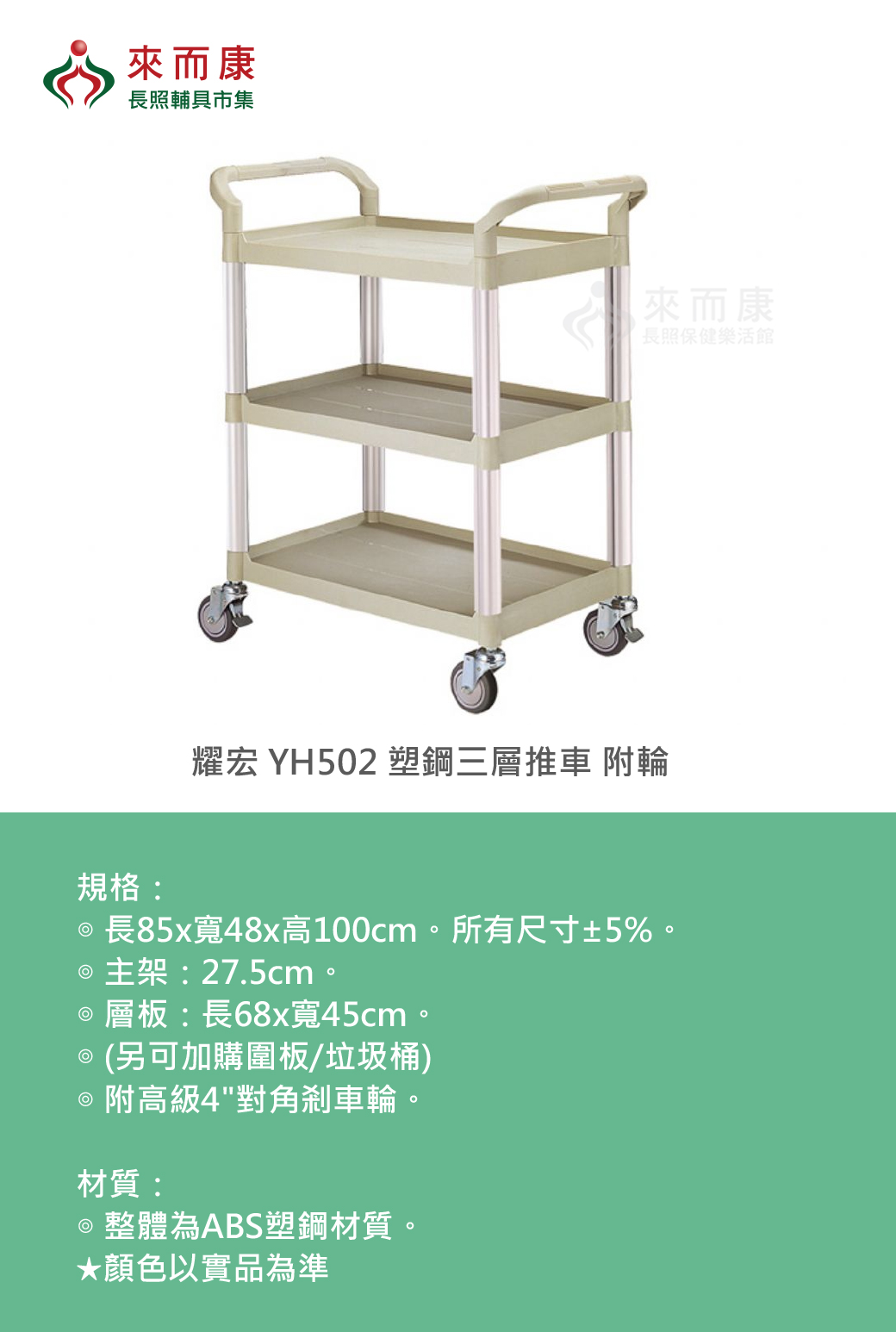 耀宏 YH502 塑鋼三層推車 附輪 塑鋼推車 工作車 UD藥車 麻醉車 護理車
