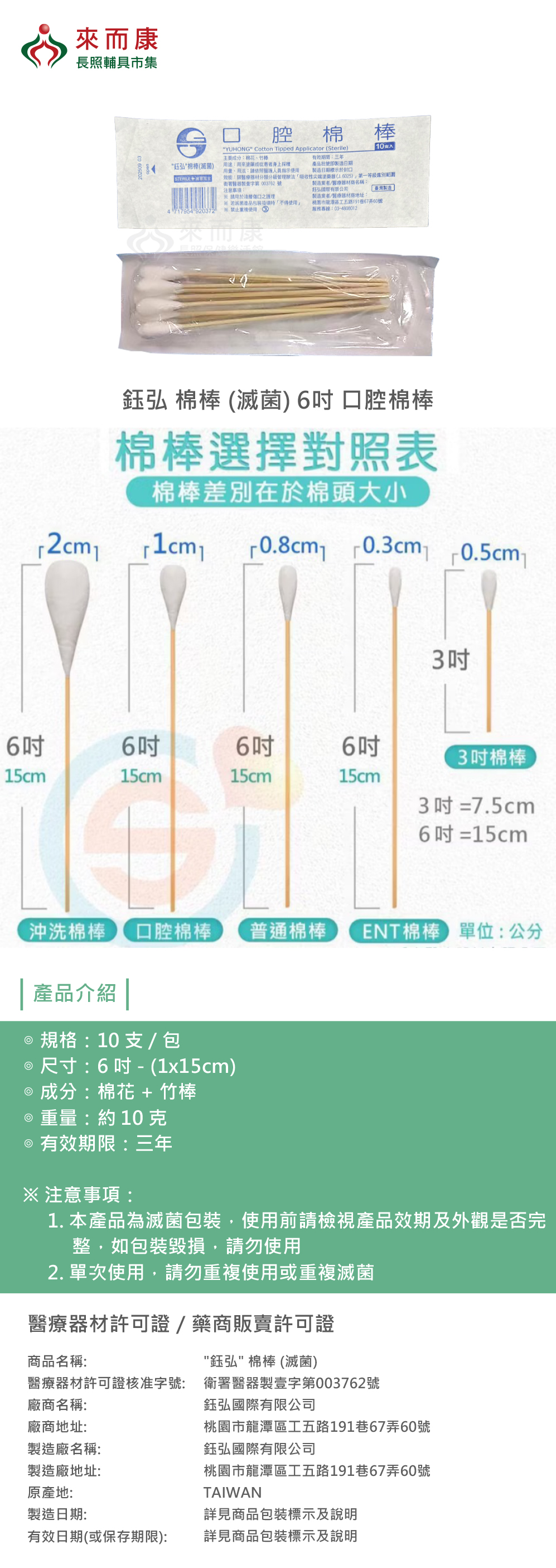 鈺弘 棉棒 (滅菌) 6吋 口腔棉棒 10支/包 800包/箱 滅菌 棉棒 口腔 棉花棒