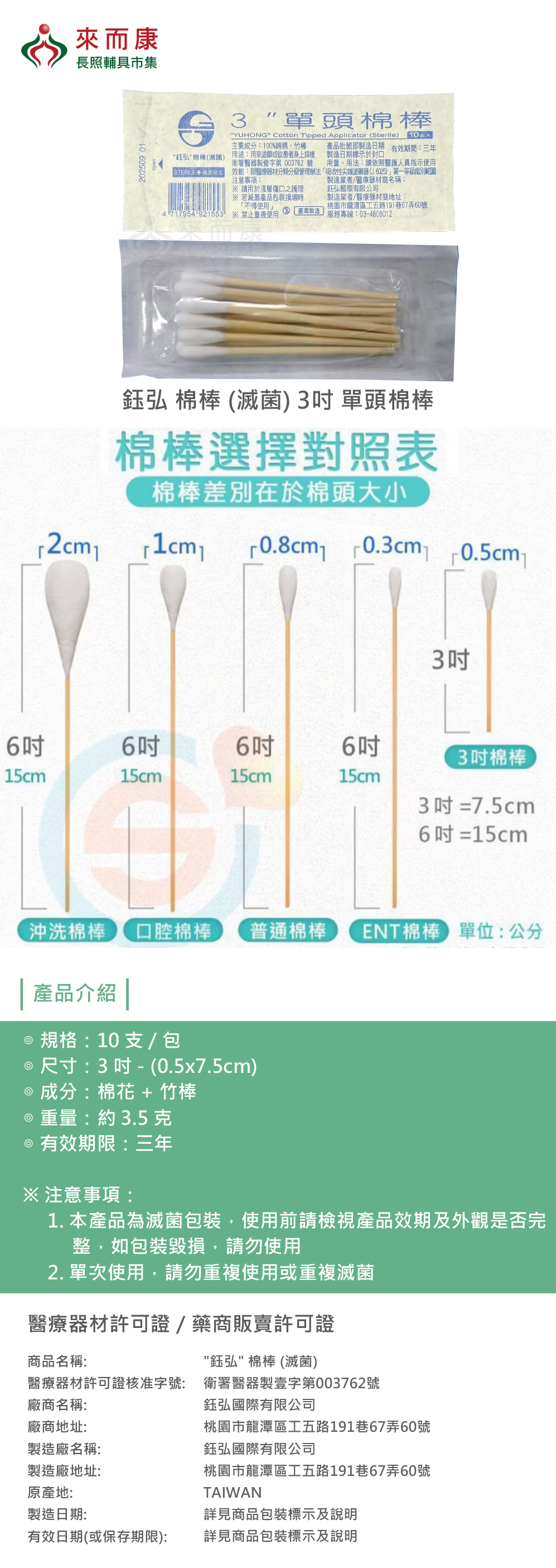 鈺弘 棉棒 (滅菌) 3吋 單頭棉棒 10支/包 2000包/箱 滅菌 棉棒 單頭 棉花棒