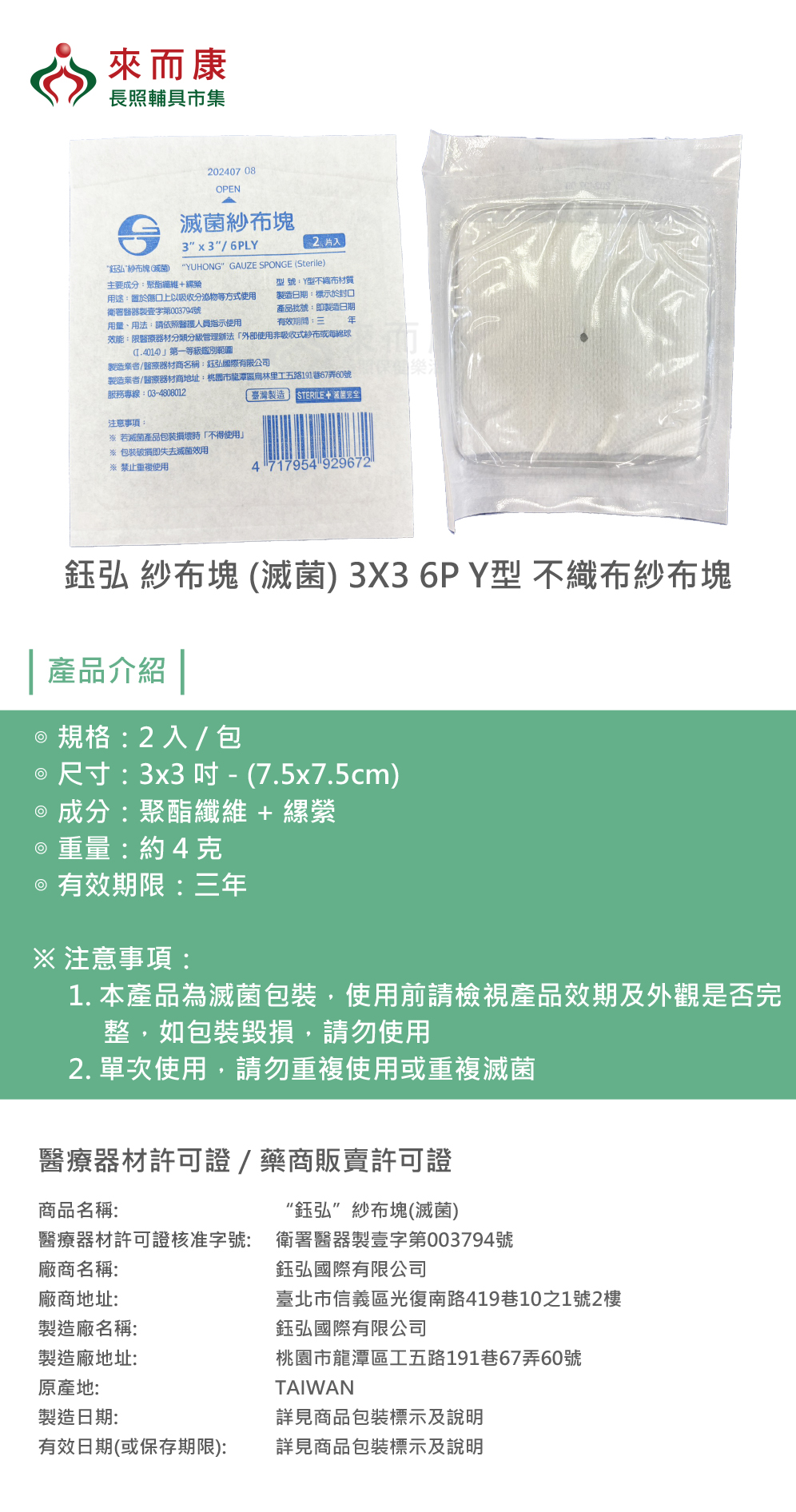 鈺弘 紗布塊 (滅菌) 3X3 6P Y型 不織布紗布塊 2入/包 1400包/箱 滅菌 紗布