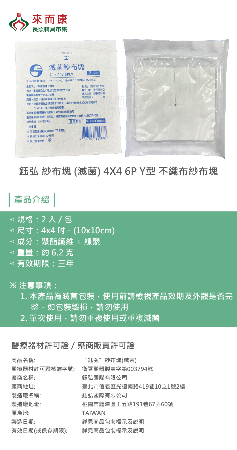 鈺弘 紗布塊 (滅菌) 4X4 6P Y型 不織布紗布塊 2入/包 960包/箱 滅菌 紗布