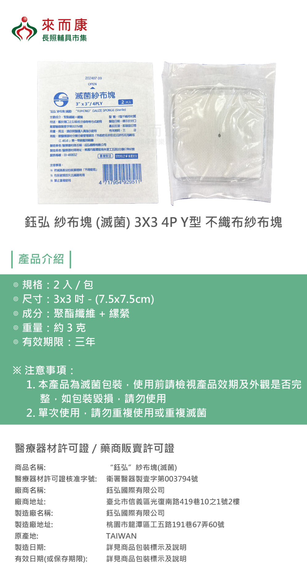 鈺弘 紗布塊 (滅菌) 3X3 4P Y型 不織布紗布塊 2入/包 2400包/箱 滅菌 紗布
